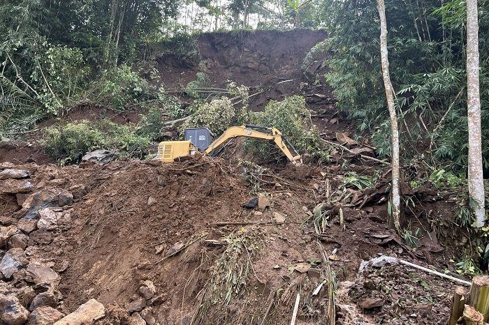 Sebuah unit alat berat ekskavator dikerahkan untuk mempercepat pembersihan material longsor.
